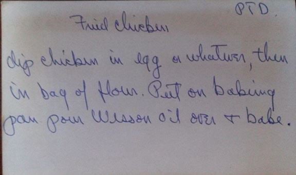 Does this recipe take you back, as it does me? I think we all have favorite old recipes from our mother, or a dear aunt or friend, that are hand-scrawled - not terribly specific about amounts and instructions… they didn’t need to be, because it was so obvious what to do. In this case, coat the chicken and bake it! This recipe came from the cherished collection of one of the Microbiome staff, and even though it isn’t mine, I look at it and can almost taste how good it is!