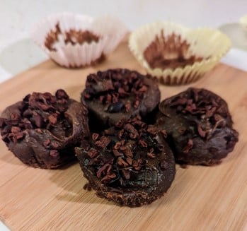 3. Spoon muffin batter into papers. Top with cacao nibs. Bake for 20-25 minutes. Muffins will be gooey (and delicious)!