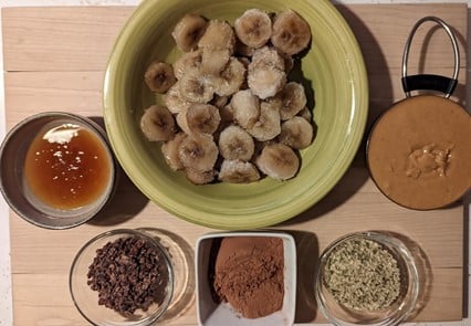 2. Combine ingredients (except for cacao nibs) in a food processor and blend until smooth, about 1 minute.